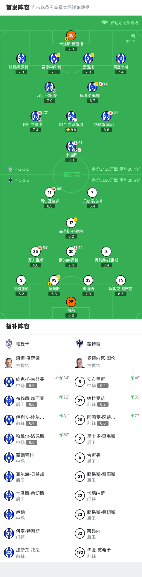 帕丘卡3-0大胜蒙特雷,埃利亚斯-蒙铁尔建功,阿列克谢-多明格斯破门